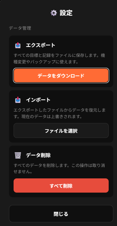ちなみにこのアプリはサーバーなどは使っていませんので、記録はすべて使っているデバイスのローカルストレージに保存されます。