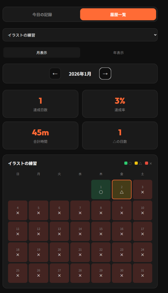 単純にやり続けたい事を設定し、「やったかやらなかったか」をひたすら記録していくだけのアプリです。