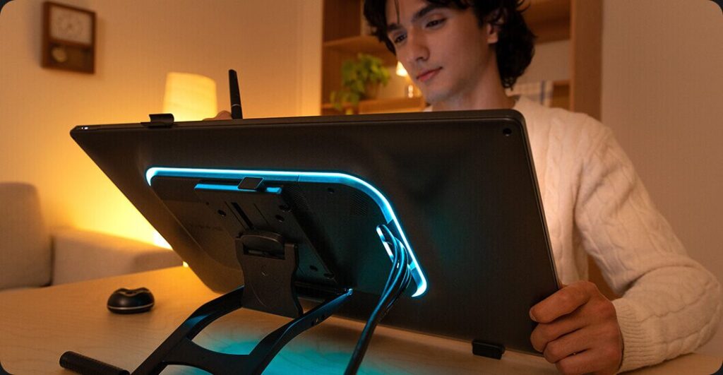 なんだかいかにもゲーミングPCみたいなライトで、色とか変えられるらしいけど、そもそも絵を描く時って割と明るくするし、背面にライトをつける優位性が見いだせない。