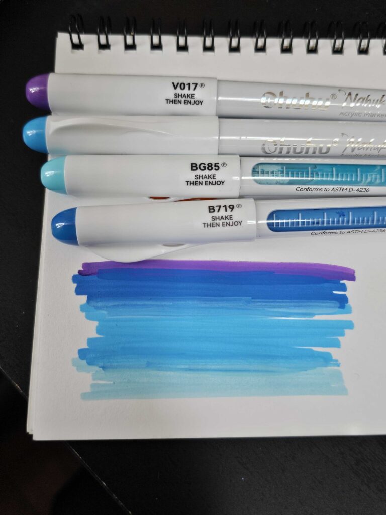 あとこの画材はマーカータイプなので、絵の具のように厚く塗り重ねたり、自由に混色したりするのは難しいです。