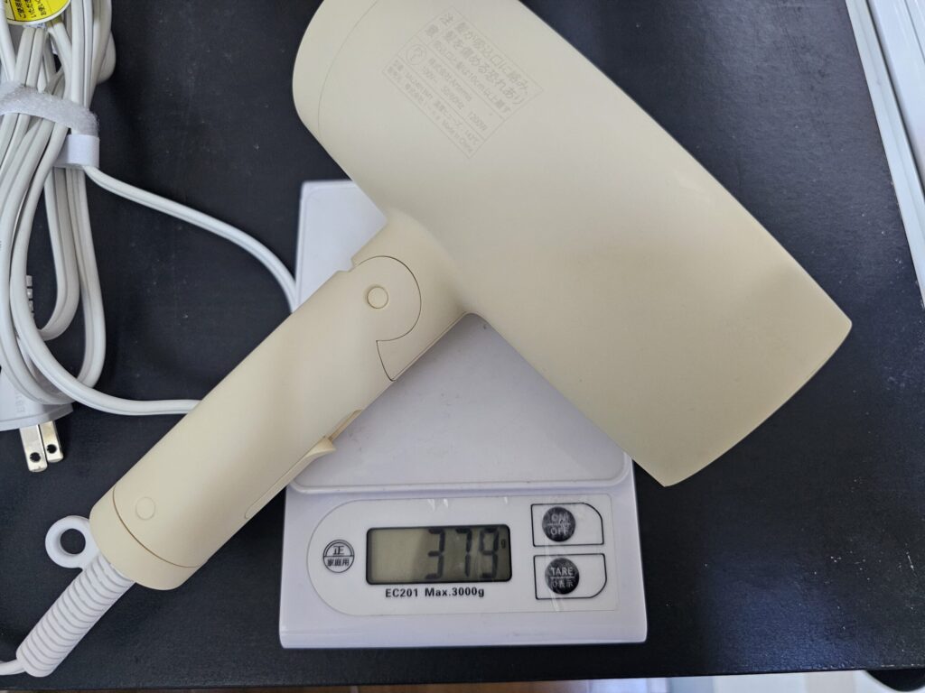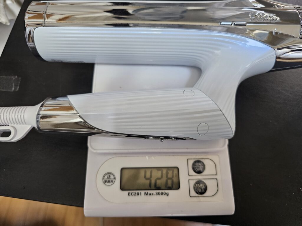 私が実際に量ってみたところ、リファの重量は428g(コードなし実測値)でした。
