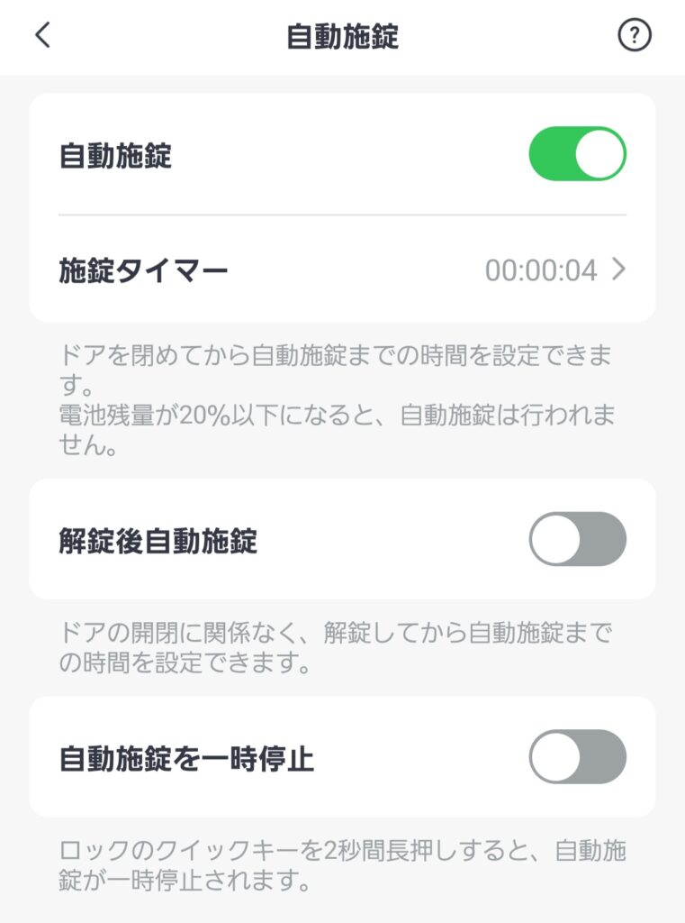 自動施錠機能を使わなければ、勝手に施錠されることはないので大丈夫なんだけど、正直スマートロックの魅力は自動施錠が5割くらい閉めているので、絶対使ったほうがいい。