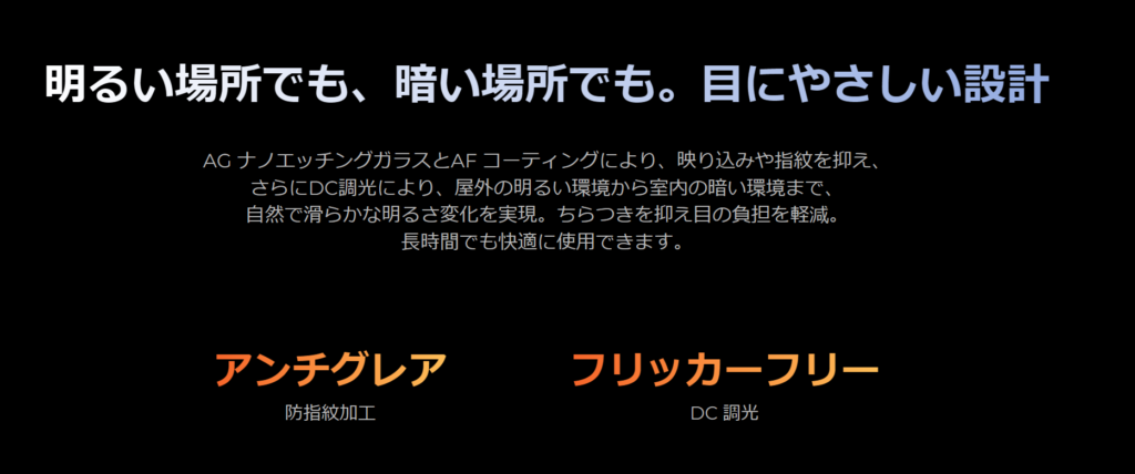 通常のアンチグレアと比べて光の散乱が抑えられ、画面の鮮明さを保ちながら映り込みを軽減でるようです。